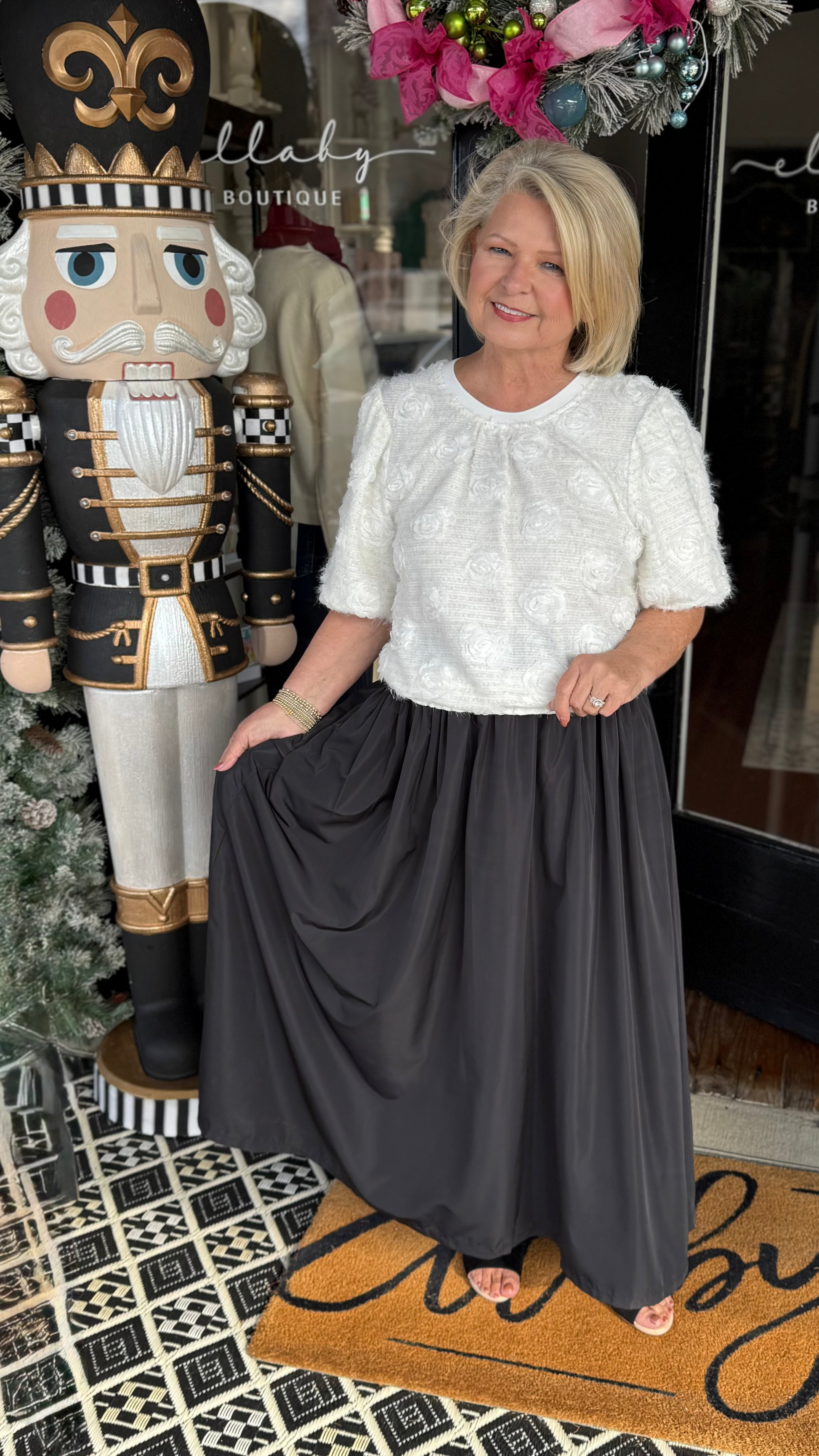 Elevate your evening wardrobe with this sophisticated black skirt, designed for those unforgettable moments. Crafted with a luxurious taffeta-inspired fabric that catches the light beautifully, it delivers that coveted party-ready elegance. The comfortable elastic waist ensures a flattering fit that moves with you throughout the night, whether you're attending cocktails or after-five events. Perfect for creating polished looks that transition seamlessly from dinner to dancing. This timeless piece is the foundation every stylish woman needs for her special occasion collection.