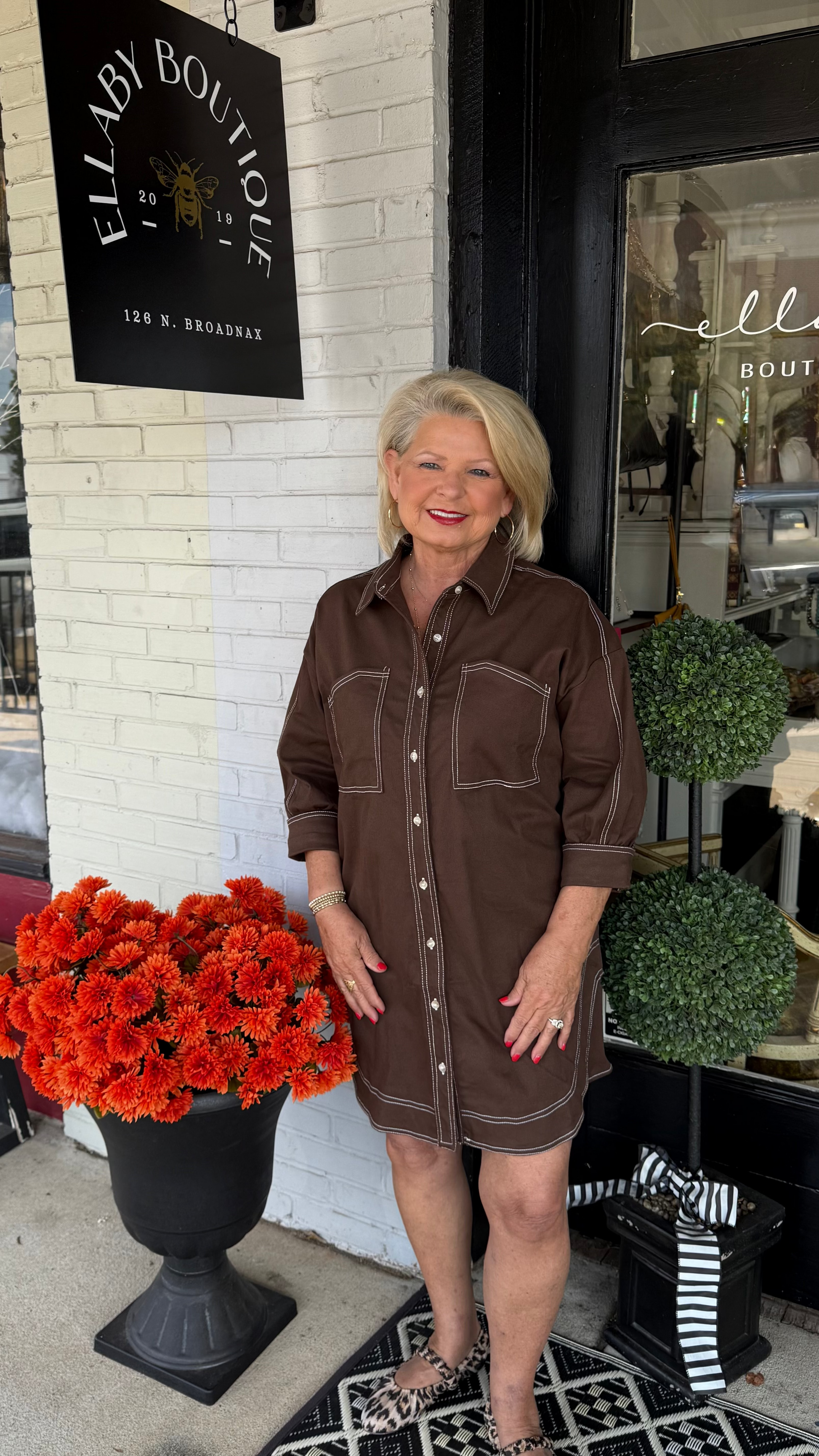 Meet your new go-to: The Mocha Stitch Shirt Dress blends casual ease with standout details. Crafted in a soft mocha hue with bold white contrast stitching, this button-down dress features a flattering straight silhouette, curved hem, and oversized chest pockets for a utility-chic feel. Perfect with sneakers for errands or booties for dinner out—this dress does it all.