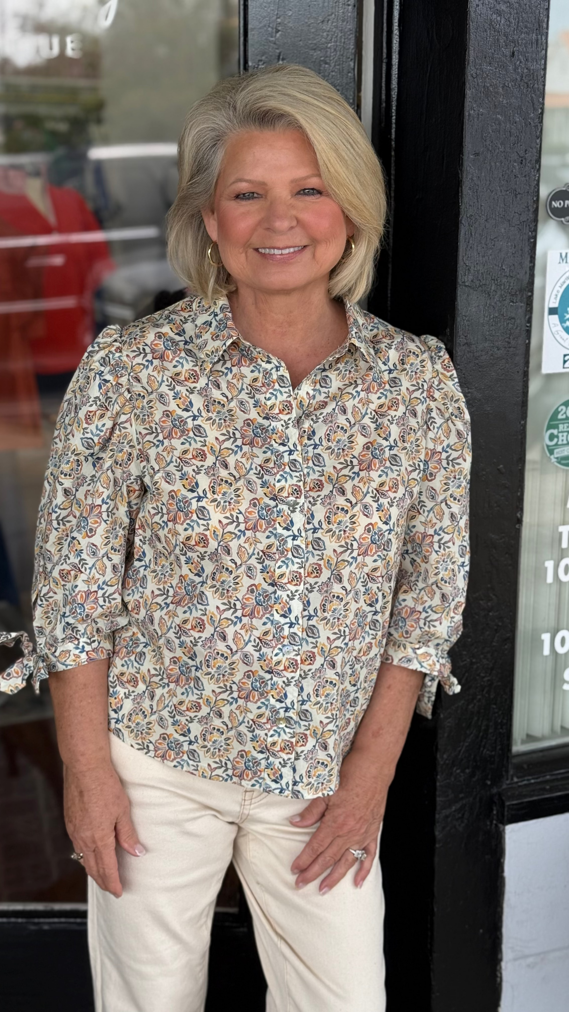 A vibrant blend of seasonal charm and timeless style, this collared button-up features a lively floral print in warm, autumn-inspired hues with hints of golden mustard, soft rose, and sage green. Designed with a relaxed fit and charming tie-cuff sleeves, it’s perfect for layering under a cozy cardigan or wearing solo for an effortlessly chic look. Ideal for lunch dates, casual Fridays, or a weekend stroll through the farmers market.